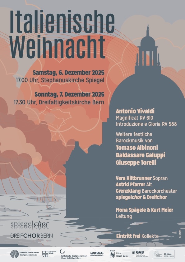 Der spiegelchor der Stephanuskirche im Spiegel und der Dreifchor der Dreifaltigkeitskirche Bern haben sich zu einer grossen und freudigen ökumenischen Chorgemeinschaft verbunden, um zwei bedeutende Vokalwerke von Antonio Vivaldi aufzuführen. Neben dem adventlichen Magnificat ist mit Introduzione e Gloria RV 588 ein gross angelegtes Stück für Soli, Chor und Orchester zu hören. Völlig zu Unrecht steht es im Schatten des wesentlich berühmteren Schwesterwerks, des oft aufgeführten Gloria RV 589. In seiner dichten Abfolge von elf äusserst kurzweiligen Sätzen vereint es alles, was zu einer musikalischen Einstimmung auf das grosse Fest dazugehört: Trompetenglanz, schwungvolle Arien, vor allem aber eine Vielzahl von Chören, in denen sich Klangpracht mit besinnlichen Passagen und komplexer barocker Fugenkomposition abwechselt. Zudem sind einige von Vivaldis weniger bekannten Zeitgenossen zu entdecken: Während die Vokalsolistinnen in zwei Arien von Galuppi zarte, stimmungsvolle Akzente setzen, wird das Barockorchester in Instrumentalkonzerten von Albinoni, Torelli und Vivaldi schliesslich seine ganze Virtuosität und mitreissende Spielfreude entfalten.