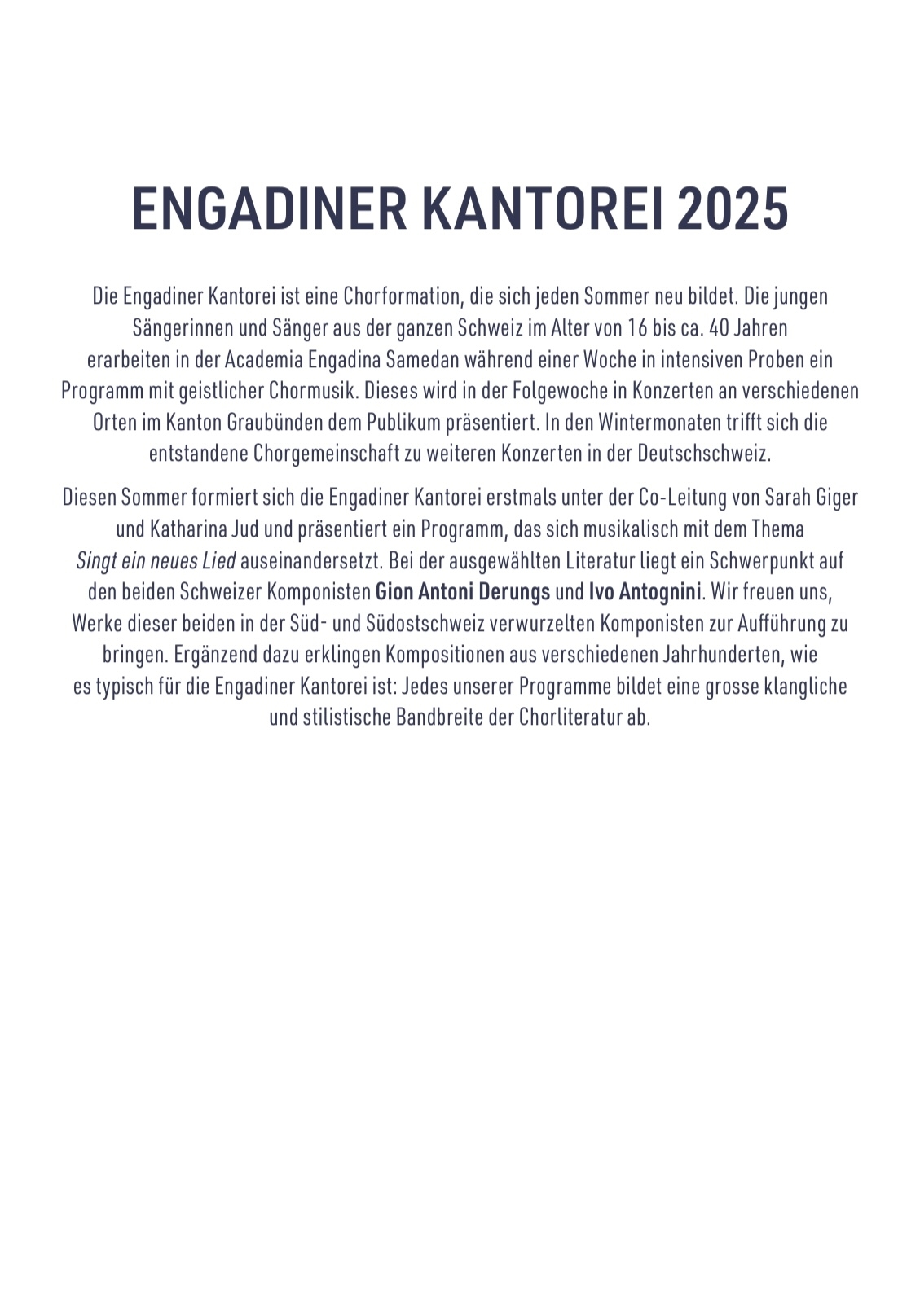 A cappella Chorwerke von Gion Antoni Derungs, Ivo Antognini, Maurice Duruflé und weiteren.