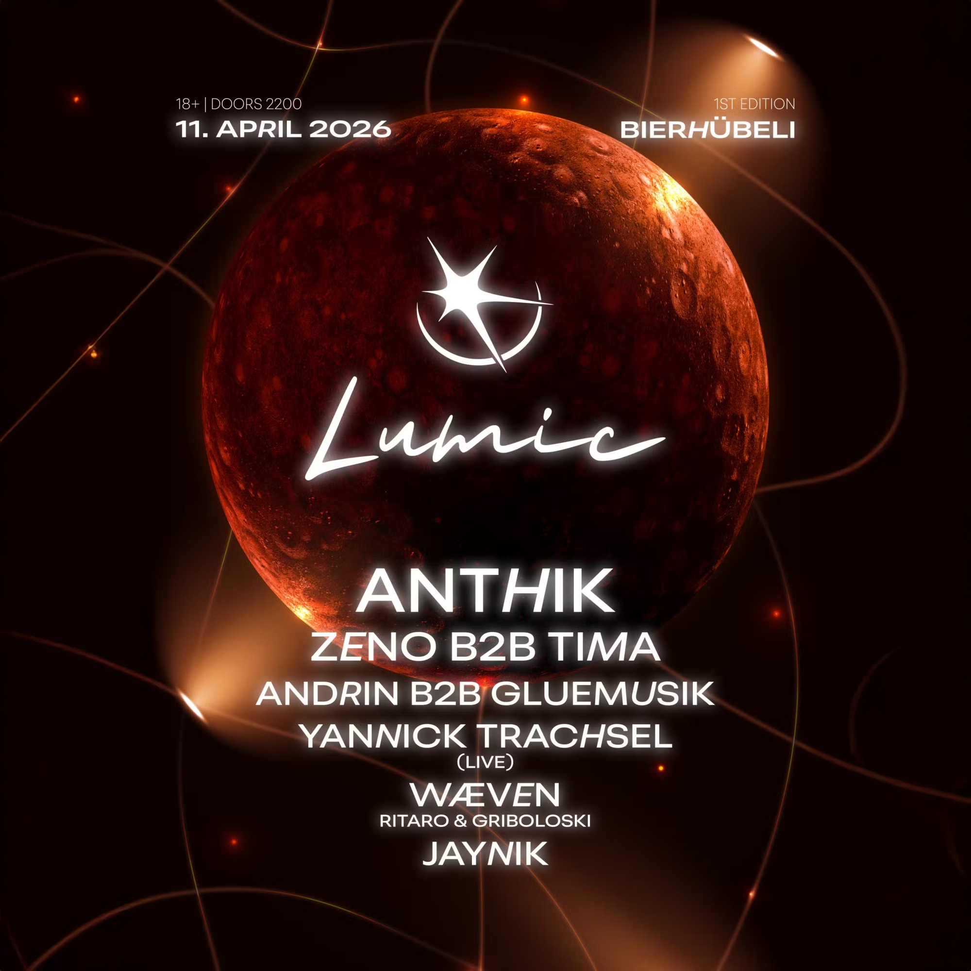Aktuell: Am 11. April 2026 startet Lumic mit der ersten Ausgabe im Bierhübeli. Die neue Reihe setzt von Beginn an auf musikalische Qualität und einen klaren Aufbau. Das Line-up verbindet Live- und DJ-Acts aus der Schweizer-Szene: Yannick Trachsel (live), Jaynik, Ritaro b2b Griboloski (WÆVEN), Zeno b2b Tima (aus Zürich), Anthik (aus Solothurn) sowie Andrin b2b Gluemusik. Ergänzt wird die Nacht durch ein hingabevolles Lichtkonzept, das auch zukünftig zu den Werten von Lumic gehören soll.
