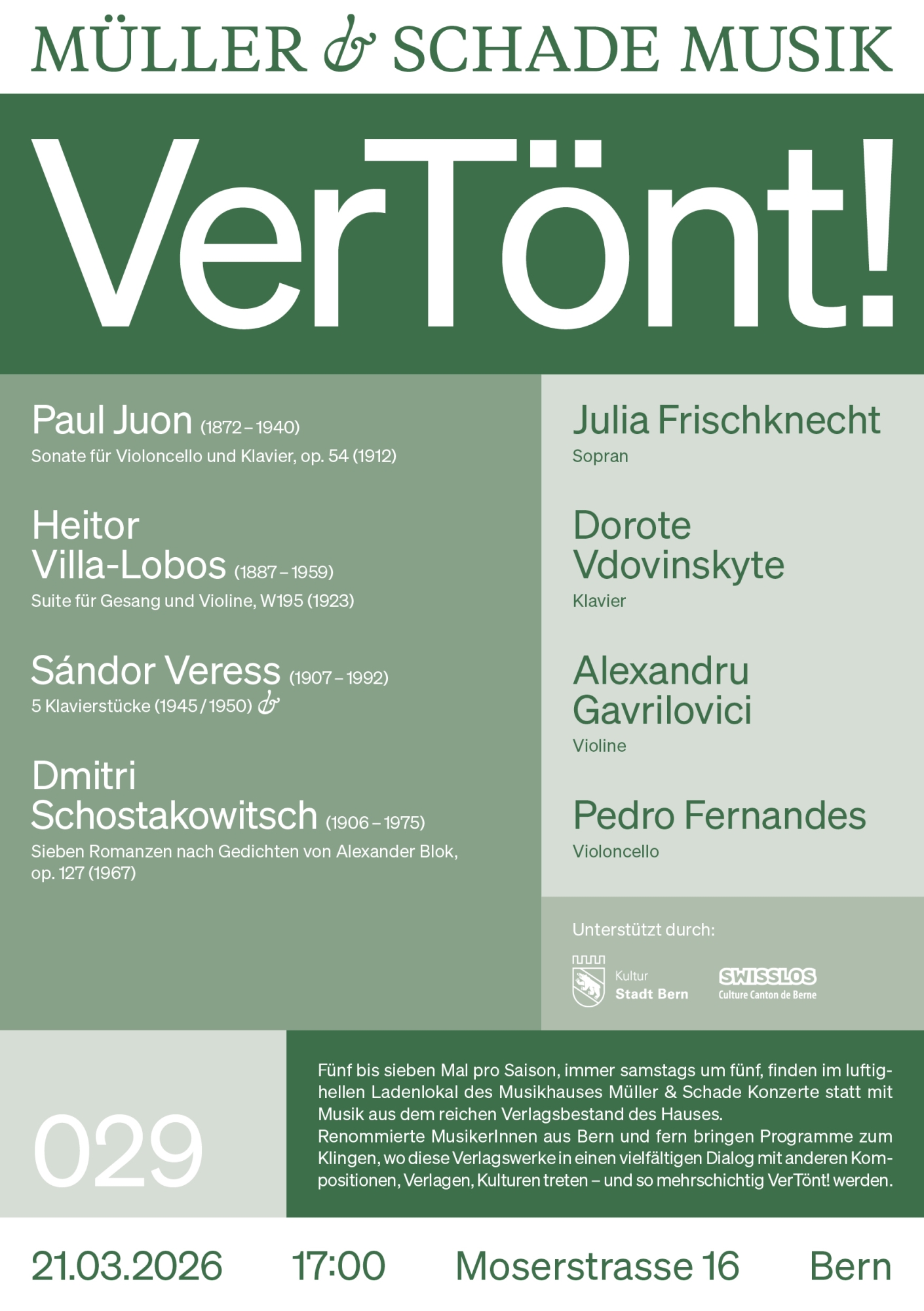 Julia Frischknecht (Sopran), Dorote Vdovinskyte (Klavier), Alexandru Gavrilovici (Violine) und Pedro Fernandes (Violoncello) spielen Werke von Paul Juon, Heitor Villa-Lobos, Sándor Veress und Dmitri Schostakowitsch
